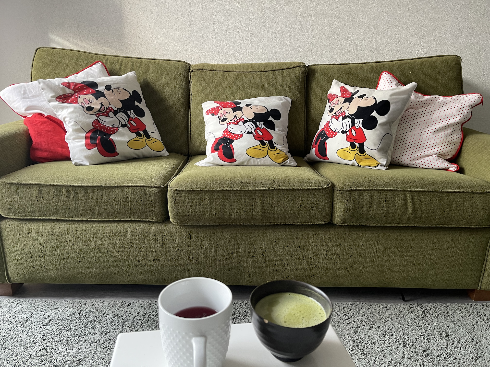 Inside the condo, small figurines adorned the walls; an assortment of characters from Frozen, Beauty and the Beast, and a stuffed Goofy greeted me each morning as I made matcha at the small kitchenette. The couch had three Mickey and Minnie throw pillows as decoration, with red and white polka dot pillows to coordinate.